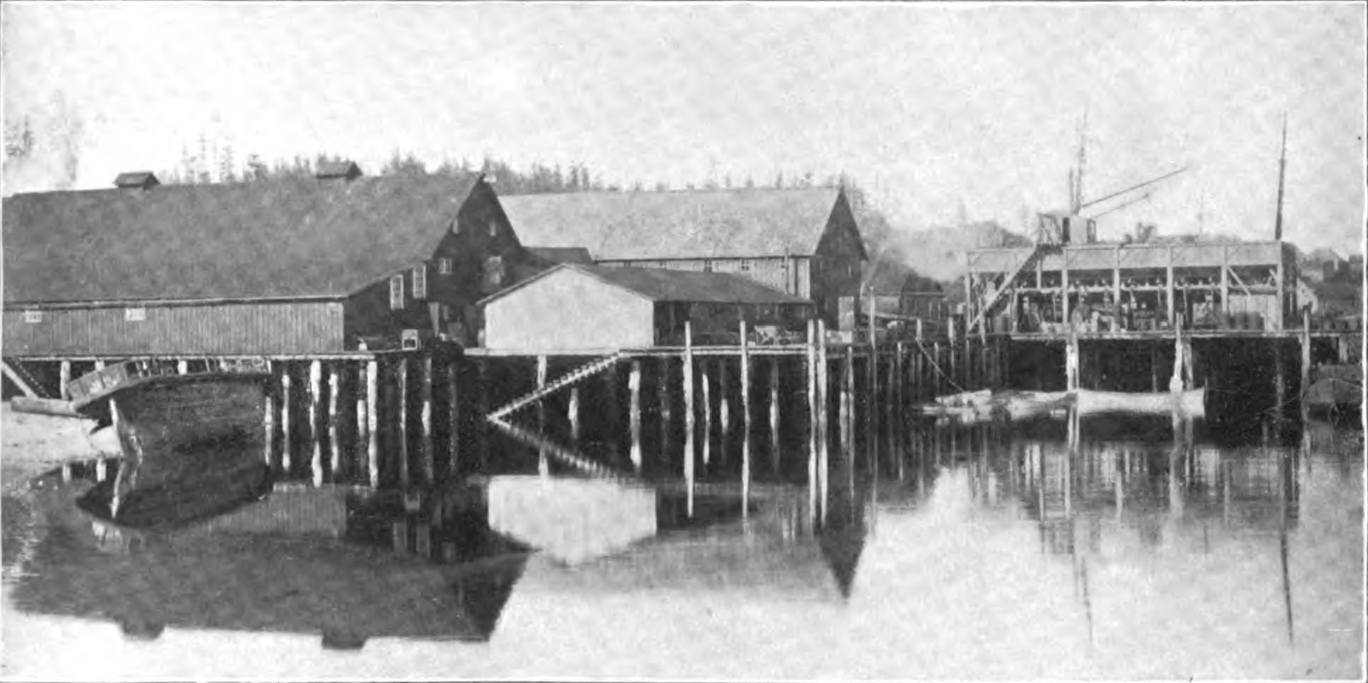 In 1901, Jefferson F. Moser of the U.S. Fish Commission on the USS Albatross stopped at Killisnoo and documented the operation. A large fish trap had been built in Kootznahoo Inlet but was abandoned when not enough herring were caught for the investment. The local herring were very rich in oil and had a strong market in the eastern U.S. The salted herring were also in demand and the plant could not fill the orders. The herring of Southeast Alaska are found in many localities and once ran in immense schools, but by 1901 the population was showing signs of stress and had disappeared in some places where they were formerly abundant. In April, the herring come close to shore in countless numbers to spawn and deposit their eggs in the seagrass, rockweed, and on the bushes hanging in the water at high tide. The Tlingit place hemlock twigs at the low-water mark, where they become covered with herring eggs, after which they are gathered in canoe loads. The inlet at Kootznahoo had been a favorite habitat for spawning herring, but by 1901 they were considerably less abundant. At that time, the Tlingit also fished for herring but only during the time they were locally present, and generally, none were cured for winter food. The fish were caught using a long stick or poles with sharp-pointed nails at the end. This pole would be swept through the water with a paddle-like motion, impaling the fish on the nails. At the end of the movement, the pole was brought into the canoe and given a shake which detached the fish. In 1928, the town of Killisnoo was destroyed by fire and although the fish plant was saved, many homes were lost and most of the Tlingit moved to Angoon. In 1940-1942, the reduction fishery was closed due to the low abundance of herring. In June 1942, during World War II, the U.S. Army Transport Delarof arrived at Killisnoo with 85 villagers evacuated from Atka in the Aleutian Islands who would spend the remainder of World War II interned at the abandoned fish plant. The Killisnoo townsite is now a sportfishing lodge. Read more here and here. Explore more of Killisnoo here: